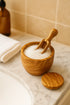 Diese runde Aufbewahrungsdose aus hochwertigem Olivenholz misst etwa 9 cm im Durchmesser und ist perfekt für deine Badesalze und Badeschaumpulver geeignet. geeignet. Ein echter Hingucker an deinem Badewannenrad!